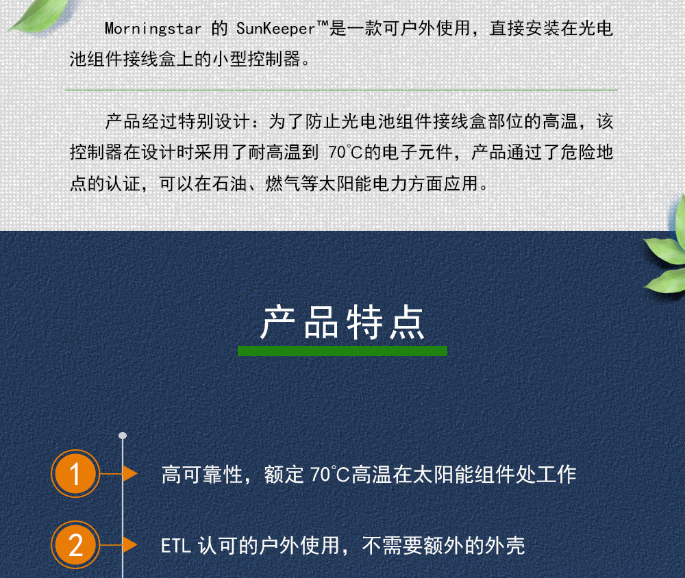 Morningstar的SunKeeper?是一款可戶外使用,直接安裝在光電池組件接線盒上的小型控制器。產(chǎn)品經(jīng)過特別設計:為了防止光電池組件接線盒部位的高溫,該控制器在設計時采用了耐高溫到70℃的電子元件,產(chǎn)品通過了危險地點的認證,可以在石油、燃氣等太陽能電力方面應用。