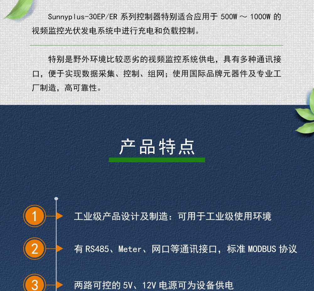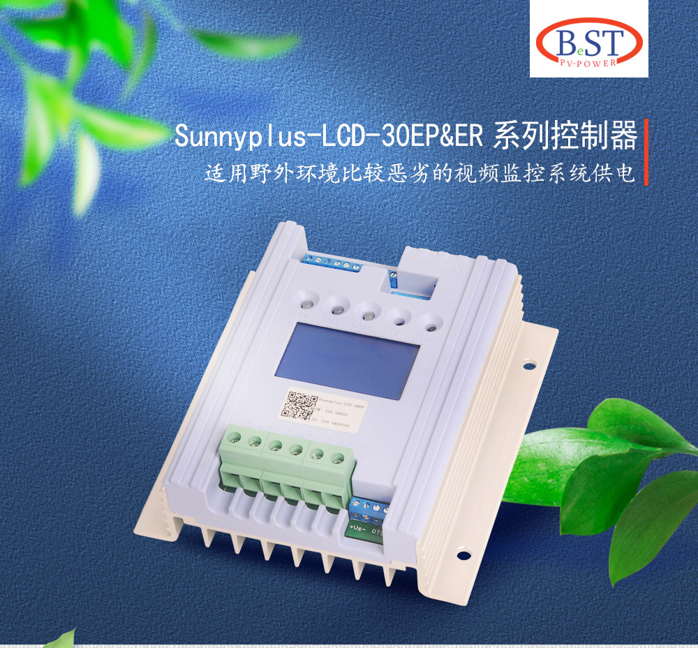 Sunnyplus-30EP/ER系列控制器特別適合應(yīng)用于500W~1000W的視頻監(jiān)控光伏發(fā)電系統(tǒng),中,進行充電和負載控制。特別是野外環(huán)境比較惡劣的視頻監(jiān)控系統(tǒng)供電,具有多種通訊接口,便于實現(xiàn)數(shù)據(jù)采集、控制、組網(wǎng);使用國際品牌元器件及專業(yè)工廠制造,高可靠性。