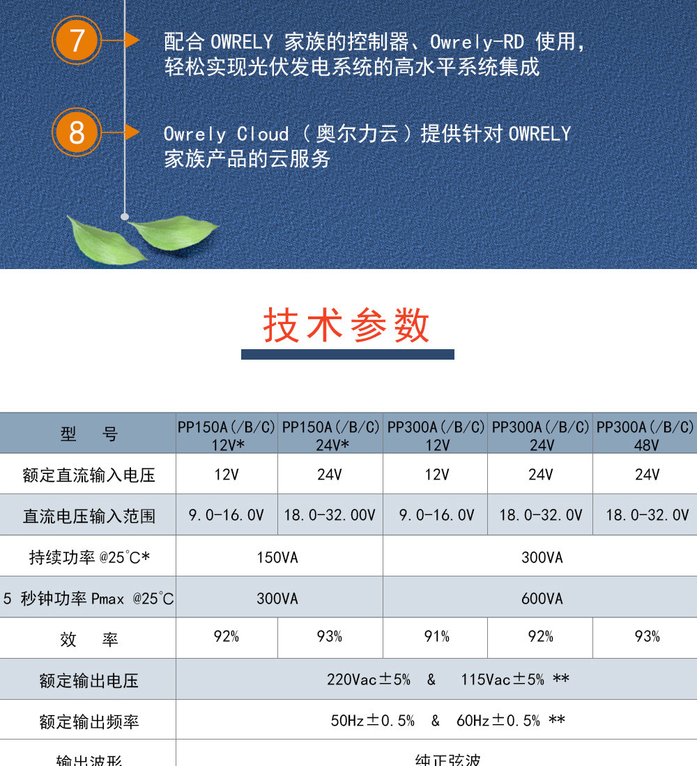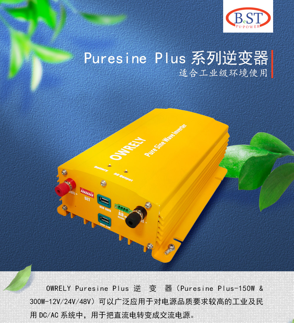| OWRELY Puresine Plus 逆變器(Puresine Plus-150W & 300W-12V/24V/48V,以下同)可以廣泛應(yīng)用于對(duì)電源品質(zhì)要求較高的工業(yè)及民用DC/AC系統(tǒng)中,用于把直流電轉(zhuǎn)變成交流電源。 |